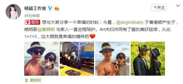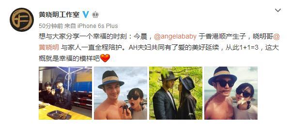 人民网北京1月17日电 (艾雯) 今天,在香港待产的Angelababy通过工作室传来喜讯:“今晨,Angelababy于香港顺产生子,与家人一直全程陪护。AH夫妇共同有了爱的美好延续,从此1+1=3,这大概就是幸福的模样吧。”黄晓明工作室也同时报喜。网友纷纷点赞送上祝福。