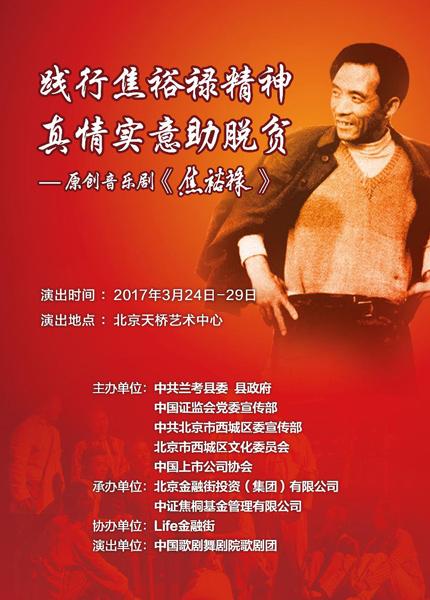 大型历史人文原创音乐剧《焦裕禄》汇报演出将于2017年3月24日至3月29日在北京天桥艺术中心拉开帷幕。诚邀社会各界人士,一起重温艰苦岁月,感受焦裕禄同志所展现出的坚韧不拔、无私奉献的伟大精神!