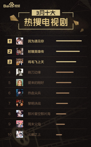 随着月初现象级IP热剧《三生三世十里桃花》的强势收官,不难发现,大IP和大流量明星依然是符合现阶段观众需求的两大制胜法宝。青春爱情剧《因为遇见你》顺势补位,播出28天,收视率破三,登上3月热搜电视剧榜第一名。这款没有明星和IP加持的电视剧的热播让我们看到,坚守电视剧品质与内容创新,也是打造出精品“爆款”剧的良方。《射雕英雄传》则延续了2月份的好口碑,凭借剧中年轻演员清新的面孔和不俗的演技稳居第二位。生活剧《鸡毛飞上天》和谍战剧《剃刀边缘》也表现不俗,一部有中生代戏骨张译,一部是文章马伊琍夫妻档再次联手,这两部剧在口碑和收视上,都交出了不错的成绩单。