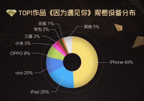 根据百度视频大数据分析显示,《因为遇见你》近一半的受众为iphone用户, ipad用户比例也不低,达到20%。从人口年龄结构看,iphone使用者主要集中在18-35岁人群。此外,《因为遇见你》观剧人群和iphone使用者的地区呈现高度吻合,该剧的重度粉丝主要集中在广东、浙江、江苏等东南沿海地区,而广东省的iphone使用量位居全国首位。伴随着iPad的销量已经连续12个季度出现下滑,其正在从年轻人手中退役,成为老妈们在家庭使用场景中的追剧神器。从观剧设备上看,该剧通过“偶像剧”和“大妈剧”的成功嫁接,对目标观众观赏习惯和“痛点”的判断与把握上可谓精准。