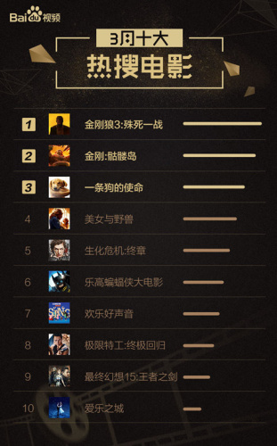 本月热搜电影榜单不出意料,开启了“好莱坞大片月”模式。《金刚狼3》以微弱优势登上3月热搜榜冠军,《金刚:骷髅岛》、《一条狗的使命》、《美女与野兽》以及2月末上映的《生化危机:终章》占据了3月电影榜的前2-5名。百度视频大数据显示,2月至3月的电影热搜榜频现黑马,2月份的《极限特工:终极回归》,3月的《一条狗的使命》创造了以小博大的奇迹,整体数据上,与春节档相比呈现观看人数增速放缓。