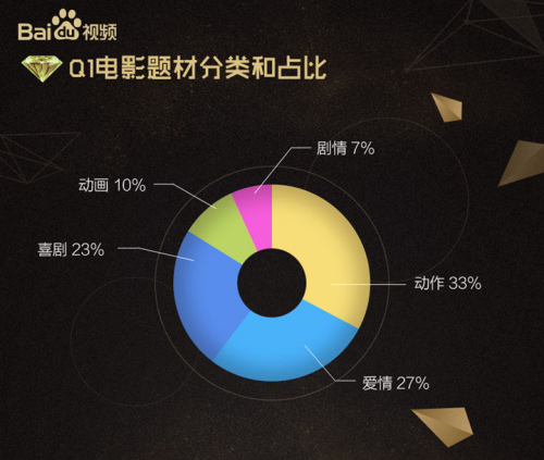 从电影题材分类上看,自2月份高居榜首的喜剧功夫片《功夫瑜伽》,到3月好莱坞的“两大金刚”,形式奔放、情绪张扬的类型影片更受观众欢迎,动作、喜剧两大类型的电影仍为电影市场主力军。制作成本高、视觉特效突出的电影保持较强的观影号召力。爱情片占比27%,主要来自《爱乐之城》、《美女与野兽》的情怀贡献。
