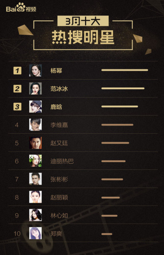 《三生三世》的余热,让关于这部剧几位主演的话题再掀波澜,从“少女幂”变身“老板幂”的角色转换,杨幂的商业价值进一步强化;赵又廷、迪丽热巴、张彬彬的上榜,也表明三生神剧余温犹在。范女神3月的微博上,不是在更新加班拍戏,就是在给“汪友”们“撒狗粮”, 踩着工作爱情两不误的小节奏,踏步跃上3月榜单TOP2;伴随《择天记》4月17日开播定档,关于鹿晗和其饰演角色“陈长生”的相关话题热度不减;自2月李维嘉担任张杰在《歌手》的合伙人后,最近的“暴瘦”和“痛哭”让网友直呼“好心疼”,背后的故事众说纷纭;自带“招黑体质”的赵丽颖凭借参加《向往的生活》入围榜单前十;而御姐林心如产后归来,与苏有朋合拍素颜照被网友赞“美出新境界”,关于“产后恢复”的各种食谱菜谱健身谱,瞬间跃上了各大话题榜单。
