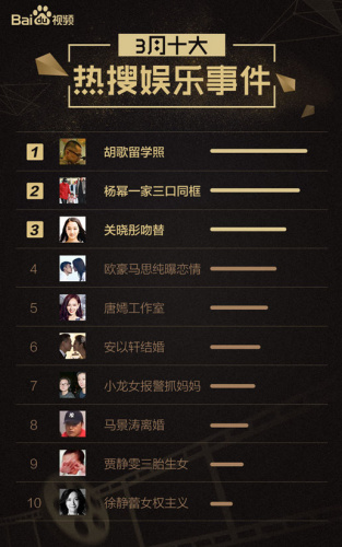 3月,娱乐新闻都比较平淡。27日,胡歌的一组美国留学照一经发布,网上就炸开了锅,窜上各大娱乐新闻榜单第一名。神态沧桑的“胡大叔”让网友惊呼“还我帅气老干部”。不过,娱乐圈中清新不做作的胡歌,除了让人心疼,更让人心生敬佩;刘恺威出轨事件逐渐淡出视线后,关于大幂幂或“婚变”或“低调维持婚姻”的各路声音一直不绝于耳。3月,杨幂一家继春节后再度同框,成为看客们热议的话题;近日,关晓彤吻替的相关消息让“国民闺女”的人设一夜崩塌,年少成名的女星被群嘲开黑可能只在朝夕之间,让人不禁感慨“贵圈”变得真快!25日,成龙私生女“小龙女”报警抓母的消息一经爆出,引发广泛关注,家庭悲剧的发生让人唏嘘不已; 3月,徐静蕾做客窦文涛的《圆桌派》,坦言“我为什么要做讨人喜欢的女孩?”才女老徐的“女权主义”与早在神坛触不可及的王菲相比,似乎更加接地气,让一众女粉丝看到了生活还有更多的选择。