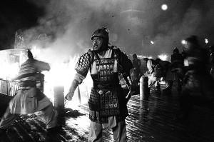 8月11日,剧组拍摄了剧中最大的一场“火戏”场面——越国派出小队人马,趁夜色秘密潜入吴国水师,大肆“火烧”。在拍摄中,剧组购置了大量的石棉瓦铺在木质甲板上,然后放置浸泡过柴油的棉布点燃。现场同时有水泵、灭火器随时准备,一个镜头完成马上冲上去灭火,生怕伤到这些价值百万的仿真战船。张纪中表示,这次“火烧战船”的场面相当震撼,不亚于当年他拍摄《三国演义》的“赤壁之战”一幕。本报综合报道