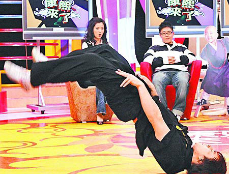 释小龙(前)昨录《康熙来了》表演在地板上翻身跃起的动作。