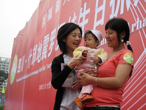 中新网5月13日电 今日,在罗汉寺内出生的“地震宝宝”们又齐聚一堂,在什邡市北京小学的操场上举行了一场别开生面的“抓周”仪式,而为他们共同庆生的还有来自全国各地的“爱心保保”们。