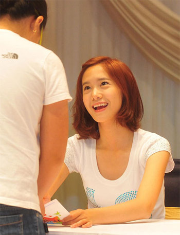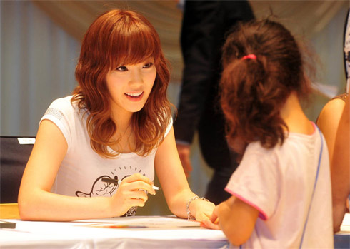 中新网6月8日电 据《朝鲜日报》消息,6月7日下午,韩国人气组合“少女时代”在仁川宋岛会展中心被委任为“2009仁川世界城市庆典”的宣传大使。图为,少女时代的成员们给粉丝签名。
