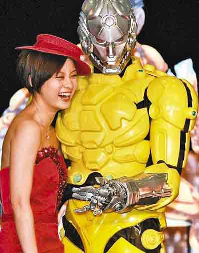 在昨天的新闻发布会上,最令人瞩目的是片中按照李小龙的造型设计的机器人,这位机器人虽然不能开口讲话,却用肢体语言表达了和台上每位主演的关系。孙俪之后拿出鸡蛋大小的“钻戒”套在机器人的手指上,更主动献吻后说:“请嫁给我吧!”
