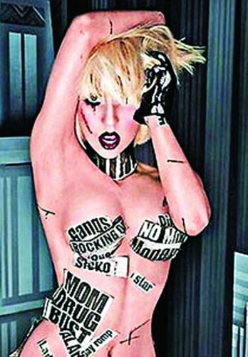 一向打着出位形象招牌的美国女歌手Lady GaGa近日为大碟《FameMonster》推出豪华版,随碟附送新拍写真集。这次她剥去奇装异服在多个造型中以几乎全裸姿态示人,其中一张与著名说唱歌手坎耶·维斯特KanyeWest的合照更是一丝不挂,尺度之大抢尽眼球。见习记者 朱艳霞