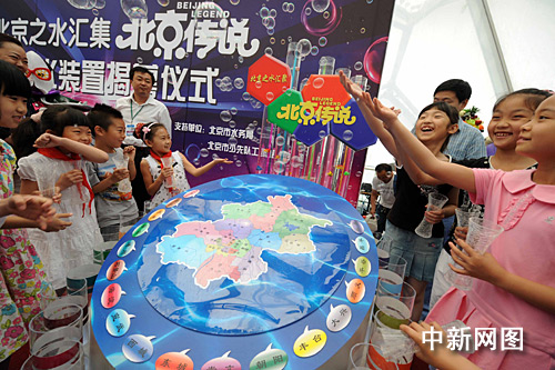 “北京之水汇集北京传说”活动是围绕北京儿艺六一大戏《北京传说》中的节水环保主题而开展的、面向北京所有小学生及学龄前儿童的大型环保节水公益行动。现场12位节水小明星代表一起把他们从北京各水系取来的水标本汇集到“北京之水”大型环保容水装置中,这一装置高1.5米,它以蓝色水波纹状物体为底座,上方圆弧状转盘中用显著颜色标识出北京水系分布情况,5月28日至6月1日《北京传说》演出期间,该容器将放置在水立方场内,成为一道环保新景观。