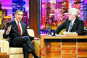 节目一开始,奥巴马就展现自己的幽默,调侃节目组的一位工作人员穿着西服好像美国特工,而主持人杰伊莱诺也幽默“回击”:“他知道总统要来,所以才穿成特工一样。”接着,奥巴马谈到了目前美国的经济形势、次贷危机、美国国际集团的分红丑闻,最后还拿自己的爱好和主持人开起了玩笑:“无论目前的经济形势多么困难,我都不会放弃自己的业余爱好,不会从篮球场离开的,除非 CIA(中央情报局)的特工们拿着枪逼迫我离开!”