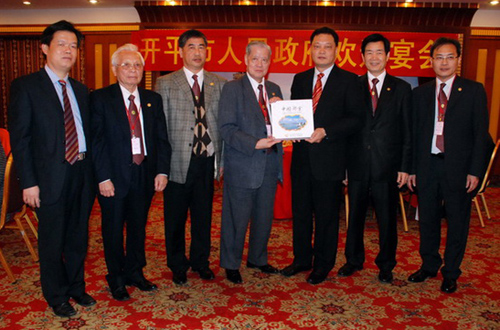 晚上,开平市政府在花园酒店举行欢迎晚宴,欢迎莅临开平市观光访问的旅港乡亲。常务副市长梁和平和外事侨务局局长冯立本、副局长谢颖岚、梁海燕等领导出席了欢迎宴会,并双方互赠礼品。