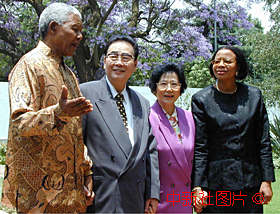 当地时间二十日上午,中国全国人大常委会委员长李鹏和夫人朱琳到南非前总统曼德拉家中作客,宾主愉快地回忆以往的四次会晤。作者:陈建 |