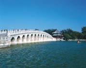 | 欣赏十七孔桥之美,有四时之美,有晨昏之美,但更重要的是从不同角度去领略,即站在园中各处望桥,和站在桥上望园中各处。比如站在桥上眺望万寿山,这是十七孔桥的最好镜头。扶着汉白玉桥栏,欣赏万寿山,水波、雕栏、长廊、绿树、崇阁、黄瓦、青天、白云,浑然一体,如世界上真有“蓬莱仙山”,也不会胜过这里。北京春天多风,在风天站在桥边,望着昆明湖动荡的波涛,似乎万寿山也会浮动起来,一线白石栏杆也成为一条幌动着的珍珠项链了。二是站在万寿山麓看“十七孔桥”,这在庚子前自然是办不到的,但颐和园开放之后,这便成为游人不可忽略的一个美丽的画面了。从知春亭一带,往北,再折而西,沿湖走,随处都能望到这一卧波长桥,宜晴,宜雨,宜雪,宜月,无时不是静静地卧在那里,如果你能坐船在湖中欣赏她,那就更美了。读者中有谁知道吗?她是无独有偶的,她有个“姐姐”,在苏州“石湖”,“石湖串月”的“杏春桥”,同她的造型一样,只是没有她华丽。如果说“十七孔桥”是“宫廷妃子”,那石湖杏春桥该是江村的浣纱女了吧。